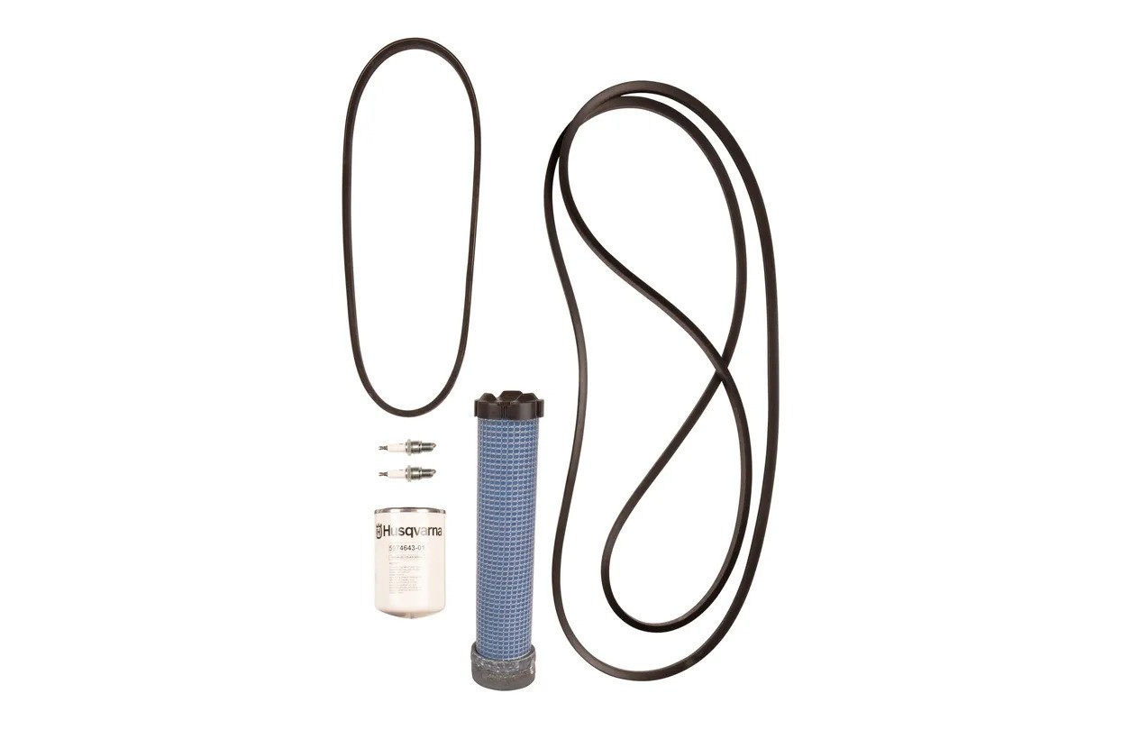 Huoltotarvike, joka sisältää esisuodattimen, sytytystulpat, hydrauliöljynsuodattimen, kytkinremmin ja hydrauliikkapumpun remmin - joka 400. tunti